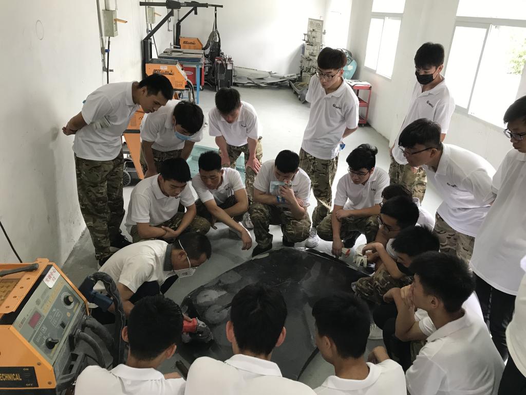 赛后,学校优秀兼职教师、车身修复课程组成员梁荣海结合十几年的实际工作经验,现场为选手们进行了车身修复技术演示,并对竞赛环节进行了生动形象的点评和总结。