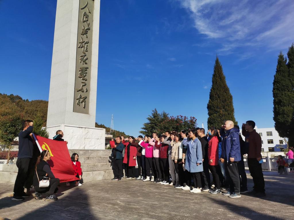 全体党员来到凉水河镇革命烈士陵园,为长眠于此在解放战争中牺牲的三位无名烈士默哀致敬,表达对烈士的崇高敬意和深切悼念之情。在革命烈士纪念碑前,大家面向党旗重温入党誓词,缅怀英烈,汲取力量。