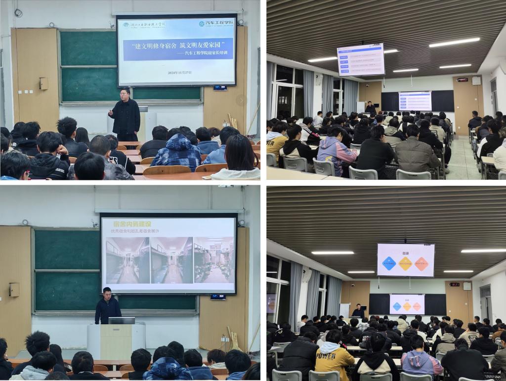 (通讯员李路)为进一步加强大学生文明素质教育,发挥学生宿舍的育人作用,进一步提升学院“修身计划”和“洁美宿舍”的效果,助力平安校园和文明校园建设,澳门十大网投平台排行于11月27日晚以“建文明修身宿舍,筑文明友爱家园”为主题举办了寝室长培训讲座。学院党总支副书记李路、2023级辅导员张领和驻院教官宁培培、詹兆辉共同主讲,260名寝室长参加培训。